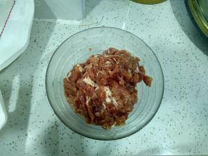 ⃣️鸡胸肉切丝倒入一勺料酒➕一勺生抽➕一勺食用油➕半勺白糖➕一勺淀粉抓匀腌制