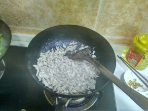 将腌制好的肉丝下锅快速翻炒到颜色变白后盛出来。