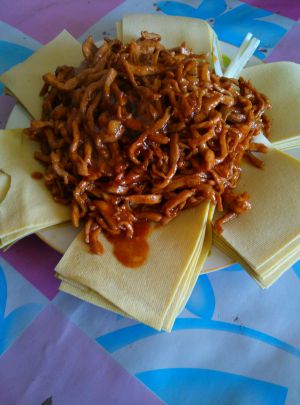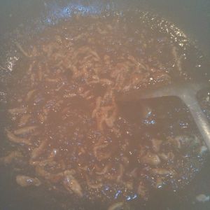 锅中烧热油,放入腌制好的肉丝翻炒至变色加入调好的汁,加盐,鸡精,老抽上色!(腌制的时候放盐和鸡精了,炒的时候适量放)煸炒均匀,到入摆好的盘中!