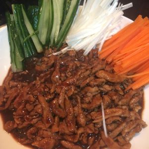 倒入处理过的里脊肉,设置2分钟/140度/1档反转即可。倒出后即可食用,可以单独准备豆腐皮或春饼皮搭配食用