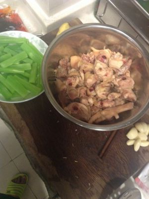 提前处理鸡肉 鸡肉切小块,倒入料酒,味极鲜,放入八角,姜,五香粉,腌制30分钟。(汤水留着,有用)