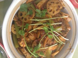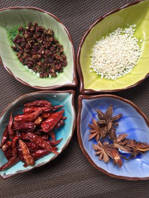 辣椒洗净切滚刀 菜花掰开洗净过水 姜蒜小米辣切颗粒放入干辣椒花椒备用 虾开背去虾线过水备用 鸡翅打花刀过水加入花椒料酒老抽煮熟备用