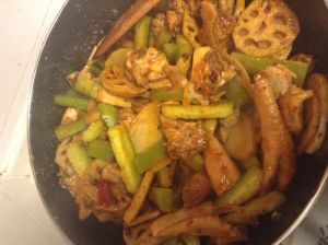 加入各种蔬菜、鸡肉,翻炒片刻,后加生抽、盐,继续翻炒