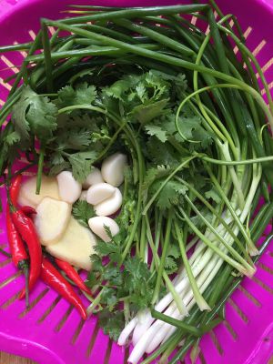 把香菜段芝麻和小米辣麻椒放在丸子上在重新起锅放适量油油冒烟之后浇在小米辣和麻椒上
