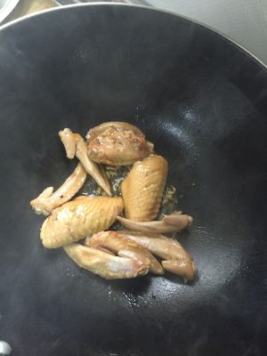 冷锅下油,将鸡翅,鸡尖煎的两面金黄(煎熟)出锅待用