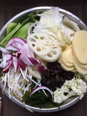 把除五花肉,鸡翅,虾,洋葱的其他材料依次放入沸水焯熟,注意火候 ,口感清脆的材料稍微煮就行,不要煮软了