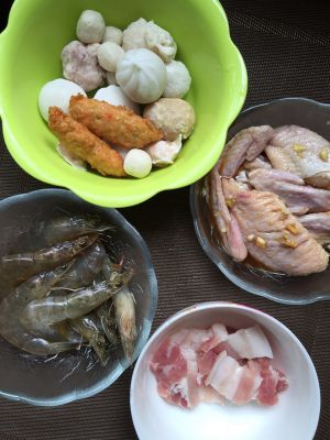 丸子,虾,五花肉,鸡翅,鸡尖(鸡翅先腌制好➕姜蒜,料酒,盐,酱油,五香粉)