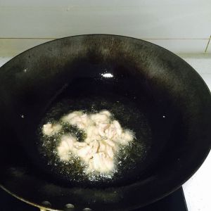 螃蟹去肺胃肠,斩大块,裹淀粉下油锅煎至定型待用