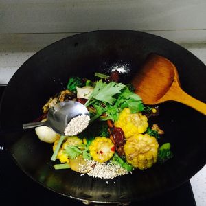 锅中放油,下炖肉料小火熬出香味儿,倒出料渣,料油放干红椒炸至变色捞出待用