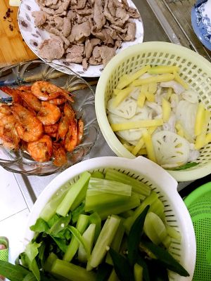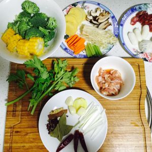 各类食材准备好,蔬菜洗净,改刀,焯水,年糕和蟹籽包煮熟,五花肉用少许料酒、生抽和淀粉腌制一下