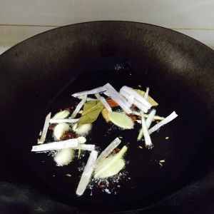热油锅,爆香葱姜蒜、大料、花椒,用漏勺或铲子捞出弃掉