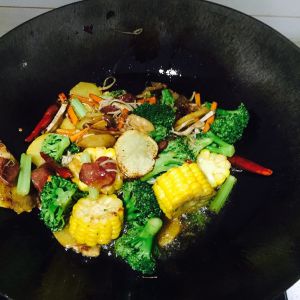 先放入肉类食材,翻炒均匀,再放入素菜,均匀翻炒片刻,食材入味后出锅。