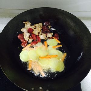 肉变白后下入香肠、胡萝卜、土豆煸炒(如果已经焯熟此时可以不放)