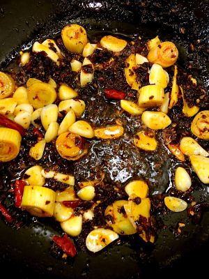 锅里放入食用油,烧热后加入葱姜蒜干红椒爆香