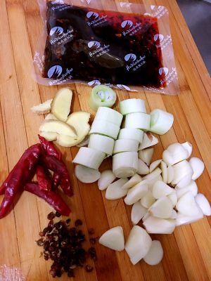 准备好调料,2个八角,4片香叶,一个桂皮掰断,姜蒜切片,干红椒掰断,一包海底捞麻辣香锅调料,一勺郫县豆瓣酱(大概30g左右)