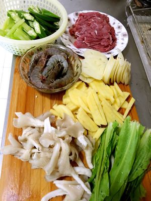 准备好食材,千张切条,莴苣切成滚刀块,魔芋切丝,鱿鱼表面划上十字刀后切小块,明虾去除虾线,香菇掰开