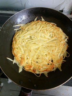 土豆丝里放盐,十三香,鸡精,拌匀。不粘锅里放油比平时炒菜的油多点即可,油五分热放入土豆丝,摊开弄好,厚度弄的都一样。然后慢慢煎。一面煎好翻过来煎另外一面。