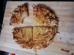 将饼两面煎至金黄即可。酥软可口的土豆饼就完成了。