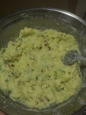 土豆弄成丝,放葱花,牛肉粉,鸡蛋面粉,盐和豆渣,加水混合成糊状。