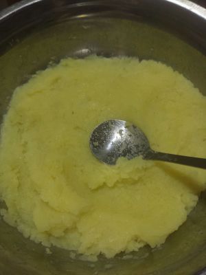 蒸好的土豆剥皮压成土豆泥。我是先用刀背压完再用勺子细压
