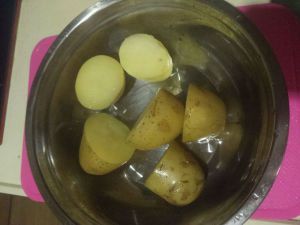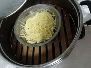 3个土豆洗净上锅蒸熟,为了快熟我都切成两半,小土豆可以整个蒸