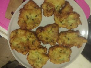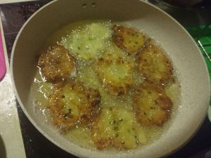 油温到八成热开始下锅炸。我是直接用勺子挖一勺放油里,没成型之前用勺背压成饼状,注意防止粘锅