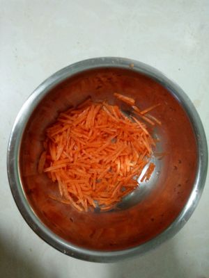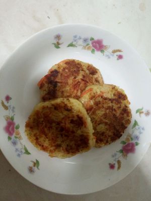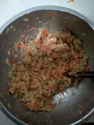 制成饼状,在电饼当里用油煎熟,因为土豆是熟的,胡萝卜可以生吃,虾也是事先抄熟的,所以饼成型有金黄色方可出锅。
