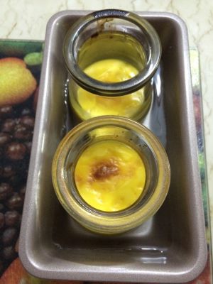 布丁液倒入瓶子中,放在加满清水的烤盘上,放入烤箱用200度上下火烘烤20分钟,直到布丁凝固即可