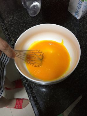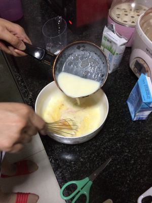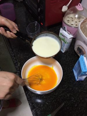 鸡蛋打散 把放凉的牛奶慢慢倒入蛋液 一边倒一边搅拌