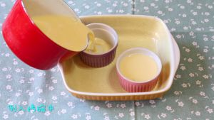 布丁液倒入烤碗中。
