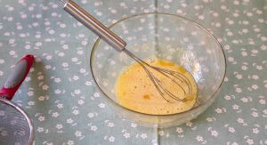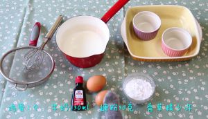 鸡蛋2个,加入香草精、糖粉搅拌均匀。将牛奶一点一点的倒入鸡蛋液里,一边倒一边搅拌。