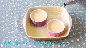 烤碗放入一个烤盘里,在烤盘里倒入开水,水量在烤碗的一半左右。放入预热好的烤箱中下层160度烤35分钟。