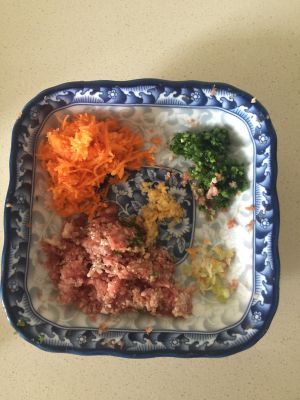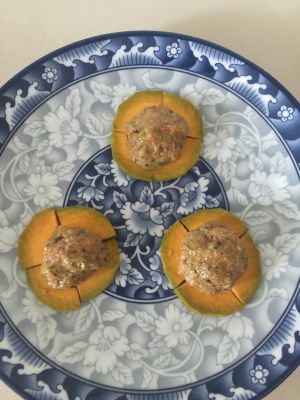 南瓜切片摆盘,将所有食材加入橄榄油和蛋液和匀(如果干可少量多次加水)团成丸子摆在南瓜上,上锅蒸10-12分钟即可