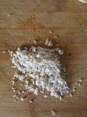 两瓣蒜切碎,香菜切小段,小碗里,用酱油,料酒,白醋,蚝油和红糖一匙调开,成汁水,备用。