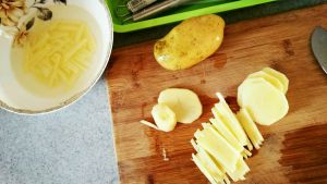 1.把土豆去皮洗净切块放入锅内蒸熟