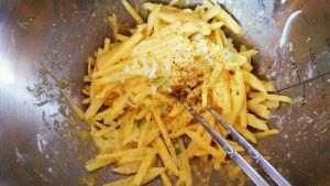2.蒸熟的土豆捣成土豆泥、放入鸡蛋腊肠粒和盐酱油
