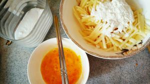 土豆丝准备好,鸡蛋两个,面粉半碗,一勺盐