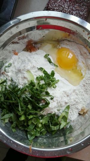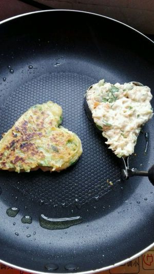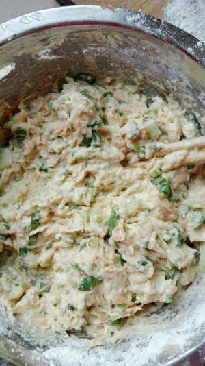 最后将土豆泥,萝卜丁,火腿丁,玉米粒,葱倒入盆中,在打入一个鸡蛋,放调料,搅拌均匀,在放面粉,双手沾油和成团(一定要双手沾油,很关键),锅里放油开小火慢煎,煎至两面金黄即可(大概8-10分钟)