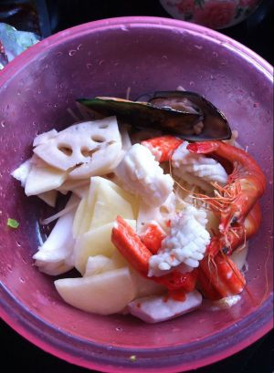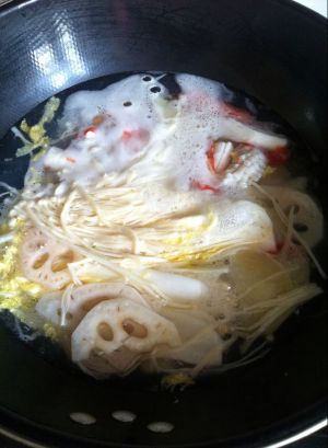 木耳,金针蘑,鱼丸,藕片开水煮一分钟,备用