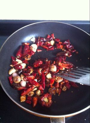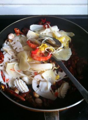 调料: 花椒粒五颗,干辣椒两粒,半包火锅料 (如果有麻辣香锅的料就更完美啦,推荐大红袍的麻辣香锅底料,我的最爱)
