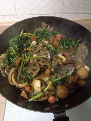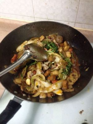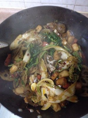 各种菜喜欢熟一点的就拿水炒一下 ~别大火哦 之后稍油 饭酱料 把不好炒的有顺序 先油 酱料 丸子神马喜欢什么放什么之后呢就是 各种菜!