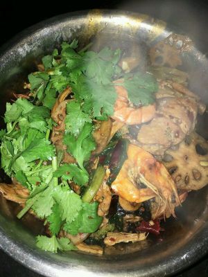 干净的锅里倒多一点油,下葱姜蒜炒香,再加入干辣椒炒香,再加入一包麻辣香锅调料炒香(用火锅底料也可以)。倒入所有煮熟的食材翻炒,炒的差不多的时候加入泡软的方便面再炒一下就可以出锅了