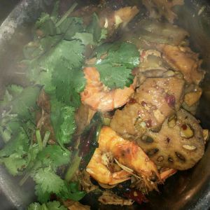把虾和鸡翅放进锅内,炒至虾和鸡翅变色,加两一勺料酒