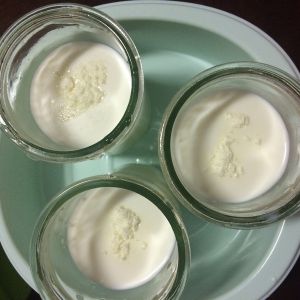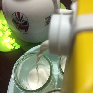 我加菌种后喜欢加点糖一起搅拌,糖可以使酸奶更好发酵,喝的时候就不加糖。要做面膜的注意不要加,会使毛孔变大。每杯搅拌1分钟,使菌种均匀溶解。搅拌完我会再加一些奶,再轻轻搅拌一次。