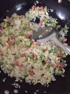 将米饭翻炒大概2-3分钟倒入适量的胡萝卜丁,黄瓜丁,火腿肠丁和玉米粒,混合一起翻炒,炒至米饭粒粒分离即可起锅,喜欢葱花的还可以撒一切葱花点缀