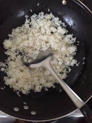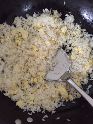 锅内加入适量油,将鸡蛋液混好的米饭倒入锅中不停翻炒,切记用小火炒才不会糊锅