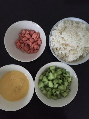 分别将胡萝卜、黄瓜、火腿肠切丁,将玉米剥粒,鸡蛋搅拌均匀,米饭用手将揉开揉到差不多粒粒分离即可