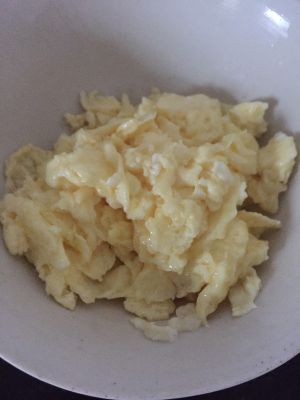 倒入少许油,鸡蛋放少许盐,然后开小火把鸡蛋先炒一下,炒嫩一点,出锅备用
