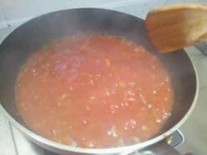 炒到看不到明显大颗粒的西红柿,这个时候就可以准备加入高汤或者开水300-400ml。这个阶段就可以进行调味,加入盐,糖