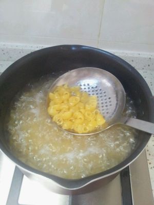 烟斗意面: 锅里加水煮沸,放入一勺盐和少许橄榄油后,下面,不加盖煮7-8分钟(熟了但还没烂,喜欢烂一点的可以再煮2分钟),出锅后沥干。